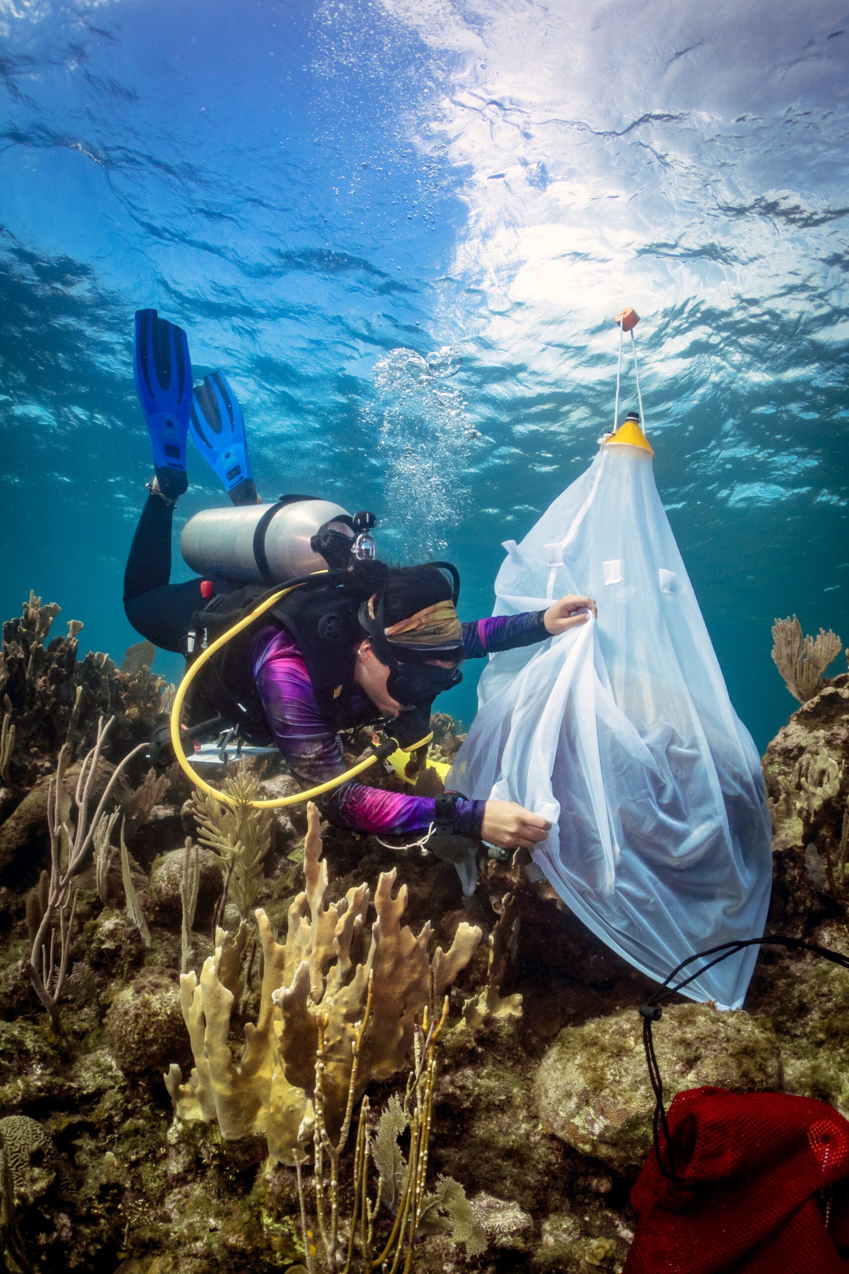 Once they confirm a particular species’ spawning time and a spawning event occurs, they collect gametes. They cover the corals with a net containing a plastic vial, which captures the gametes as they float upward.