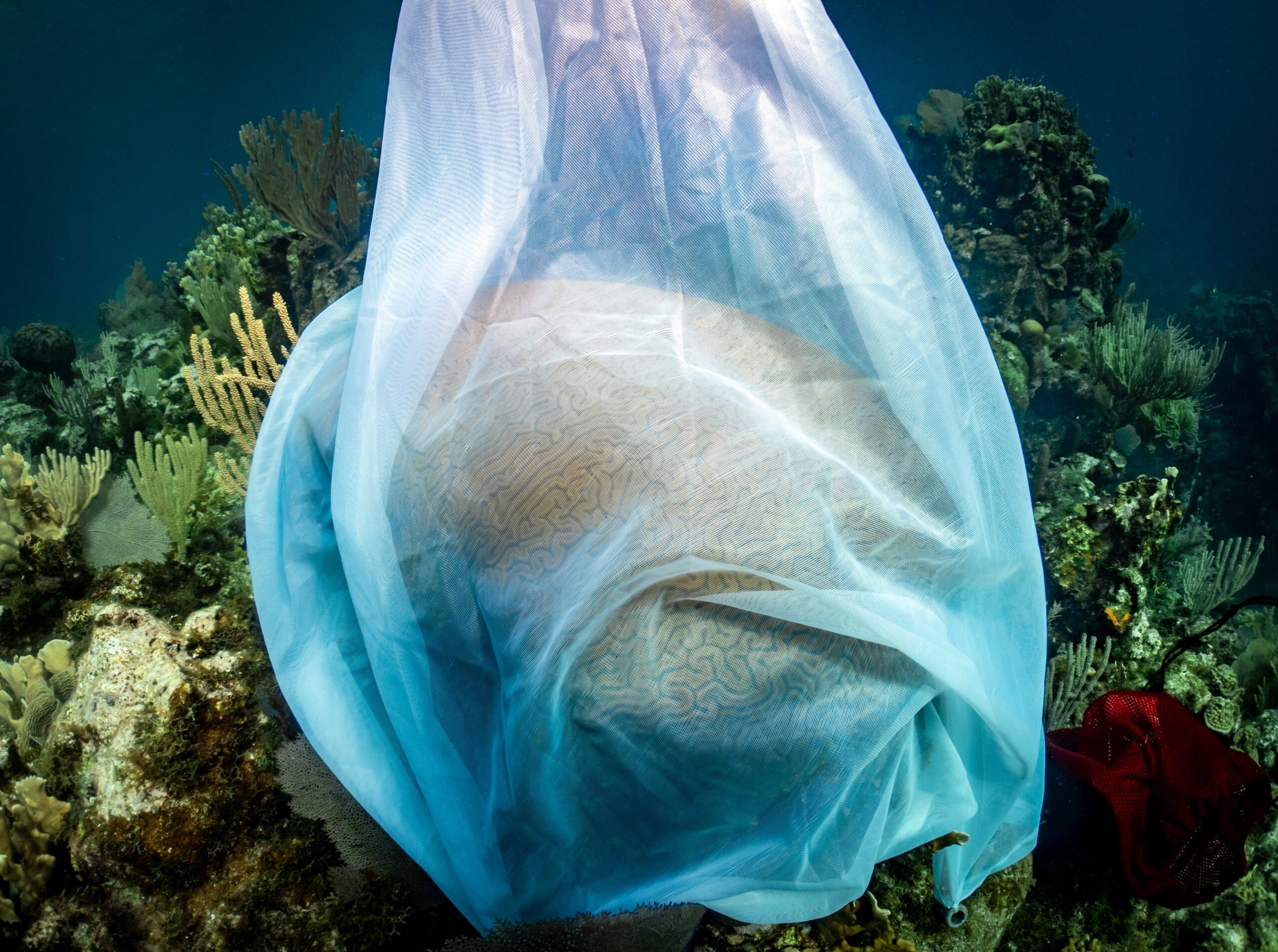 Grooved brain coral covered by gamete collection net. Photo Credit: Gil Sassi