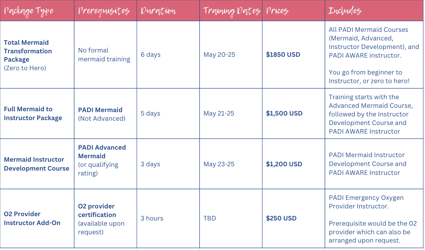 - Complete the full PADI Mermaid Instructor Course